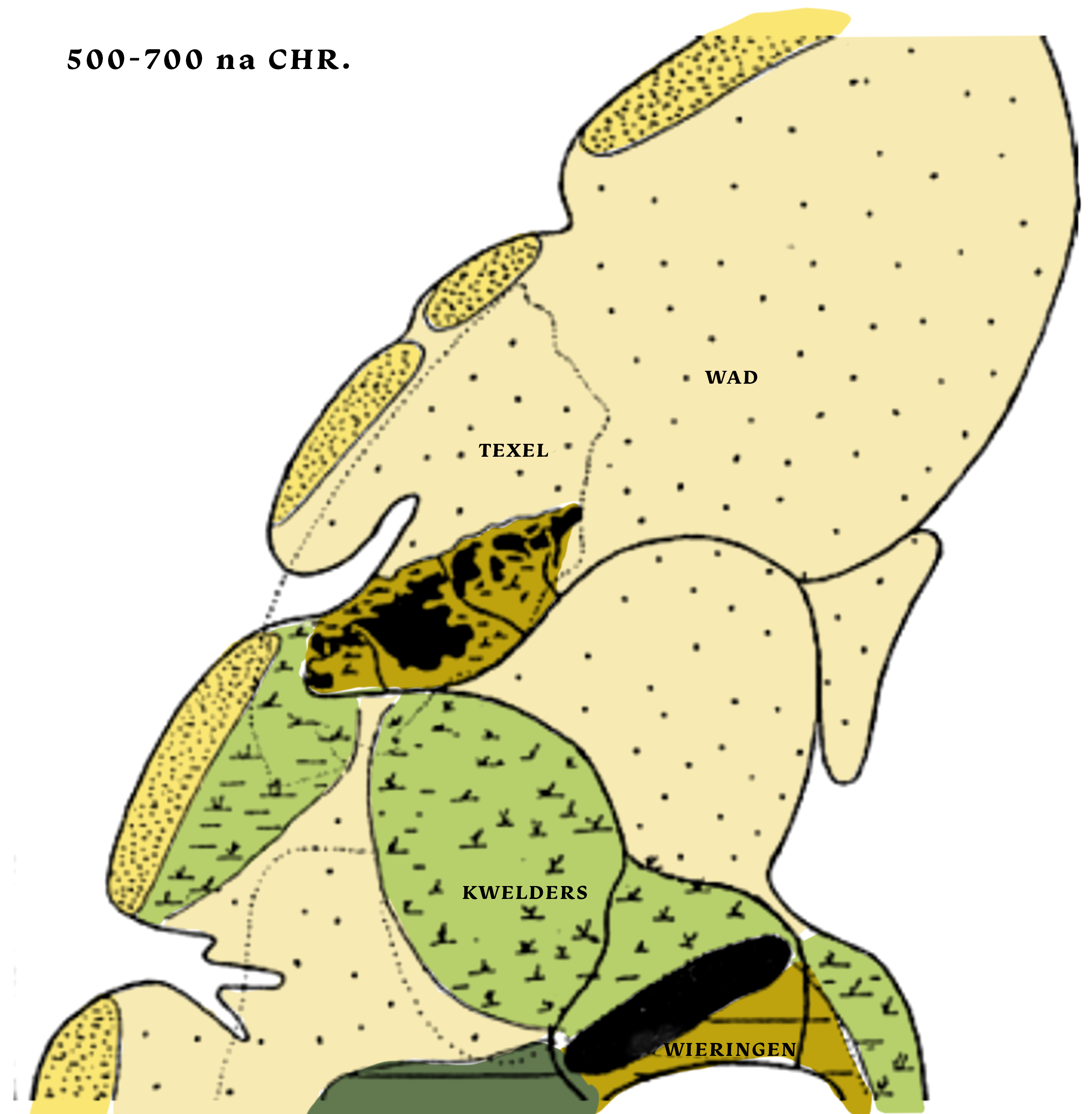 In de eerste eeuwen van onze jaartelling kwamen in het gebied dat nu Texel is zogenoemde washovervlaktes voor: stukken land die bij stormvloed onderlopen. Hoge duinpartijen waren er in die tijd nog niet. Elke stormvloed liet diepe sporen na. Zeegeulen ontstonden of verdwenen weer, door dichtslibbing en verstuiving. Deze zeegeulen waren voor de toenmalige bewoners belangrijke aders om zich te kunnen verplaatsen én om zich erlangs te vestigen. Om de vestigingsplaatsen van toen te begrijpen, moet je dus inzicht hebben in waar de zeegeulen liepen.