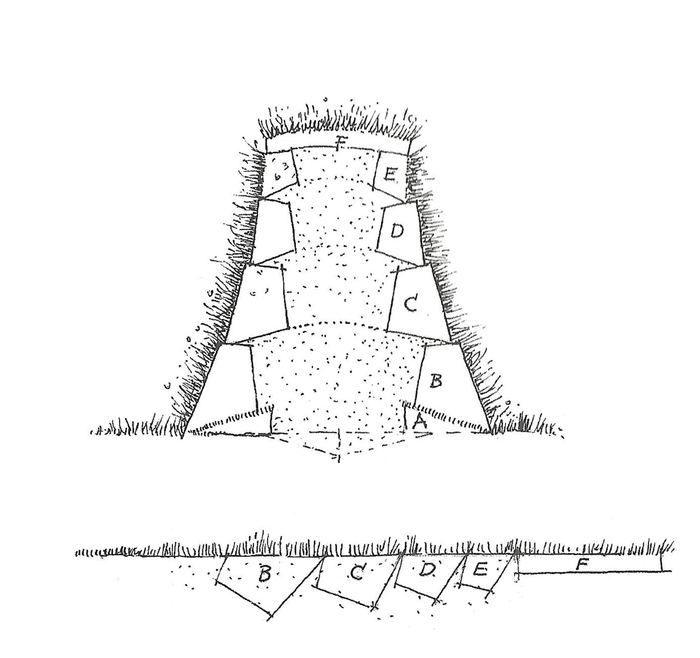 Zoals je in de schets kunt zien bestaat de tuunwal uit twee op elkaar gestapelde ‘muurtjes’. ‘Opbouw volgens de plattezodenmethode’ betekent dat de tuunwal bestaat uit acht lagen graszoden, plat gestapeld, en binnenin opgevuld met grond uit het naastliggende weiland.